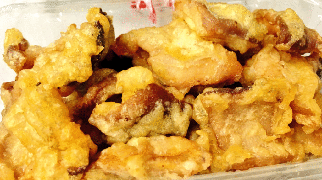 魚すり身に玉ねぎや唐辛子を混ぜ揚げた練り物。表面はさくっと中はふんわり、地元ではスーパーや駅ナカで普通に売られている定番おかずです。