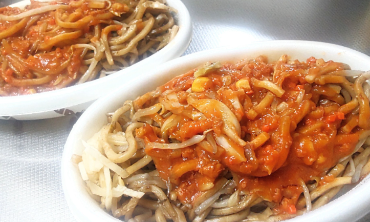 焼きそばにミートソースをかけた斬新な料理で、県外の人が驚くフードの代表格。